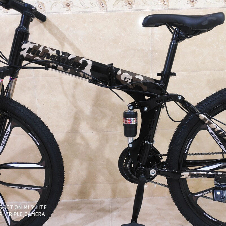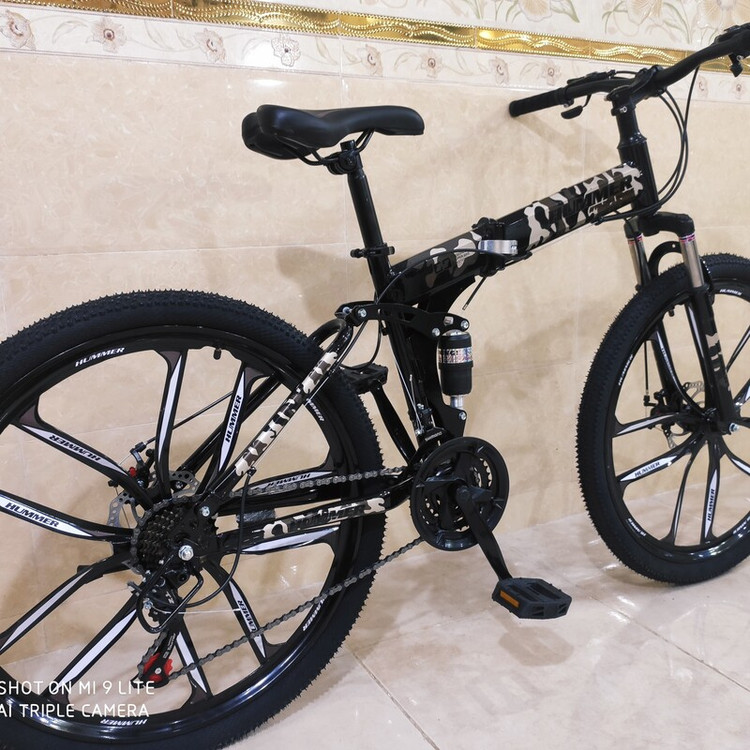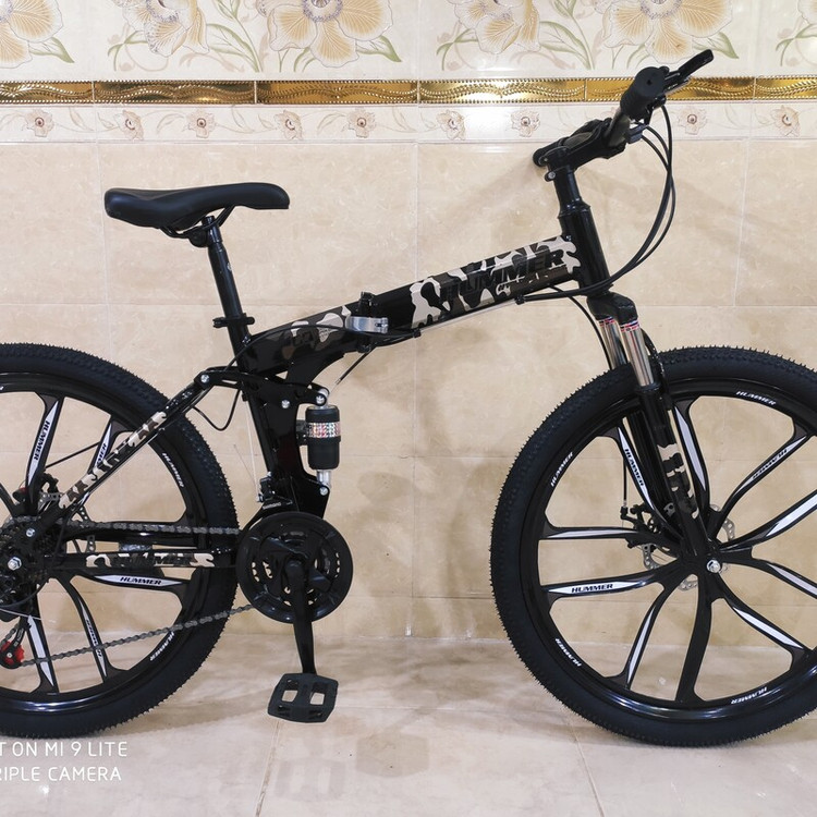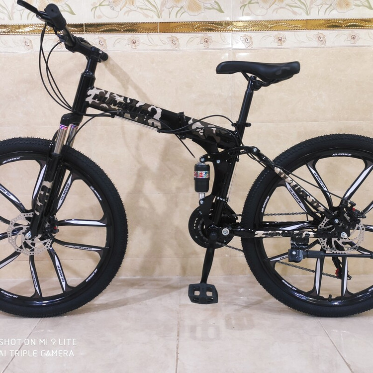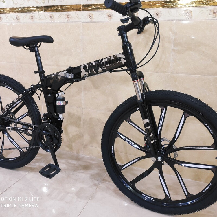 دوچرخه تاشو سایز ۲۶ هامر hummer رینگ ۱۰ پره تمام الومنیوم طبق عوض کن شیمانو شانژمان و دسته دنده شیمانو قابلیت تنظیم ارتفاع تنه دوچرخه از سایز ۲۴ تا ۲۷ مناسب تمام سنین از ۱۰ سالگی تا بزرگسال زین پهن طبی فنردار فرمان شاخ گاوی لاستیک نخی کندا kenda دو کمک جلو و کمک وسط ۲۱ دنده شیمانو ترمز دیسک شیمانو