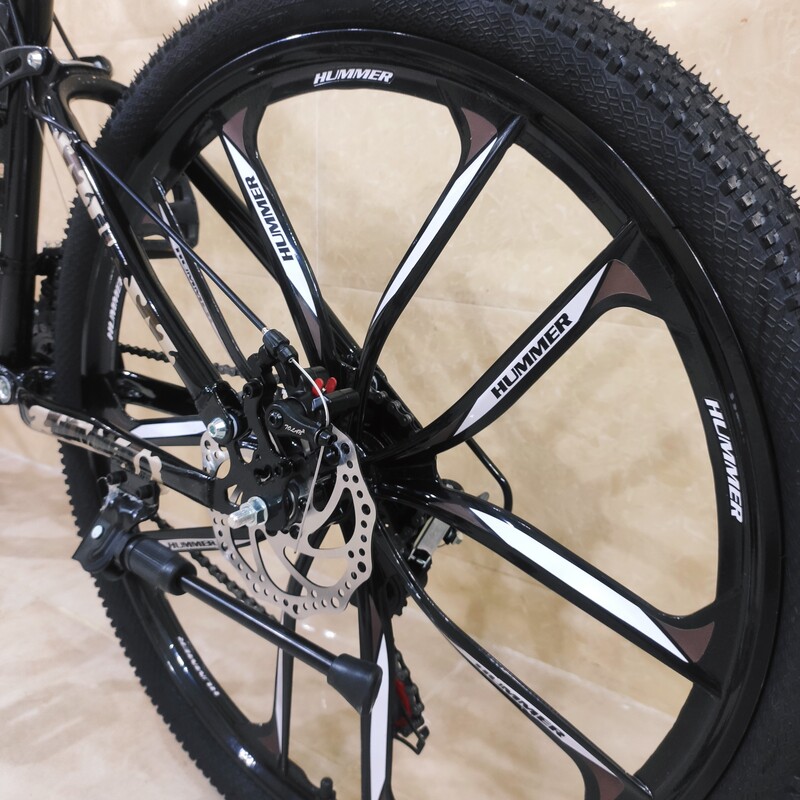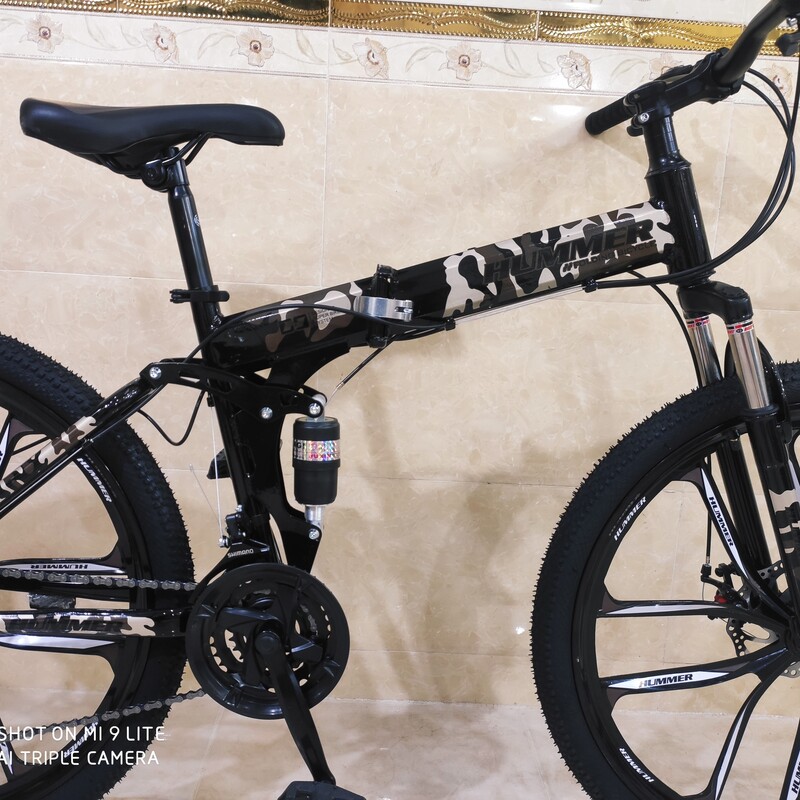 دوچرخه تاشو سایز ۲۶ هامر hummer رینگ ۱۰ پره تمام الومنیوم طبق عوض کن شیمانو شانژمان و دسته دنده شیمانو قابلیت تنظیم ارتفاع تنه دوچرخه از سایز ۲۴ تا ۲۷ مناسب تمام سنین از ۱۰ سالگی تا بزرگسال زین پهن طبی فنردار فرمان شاخ گاوی لاستیک نخی کندا kenda دو کمک جلو و کمک وسط ۲۱ دنده شیمانو ترمز دیسک شیمانو